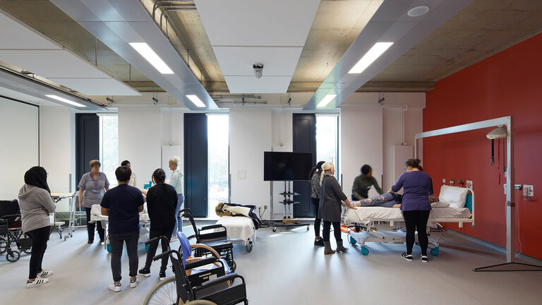 Highly specialised facilities have been designed to replicate the ‘patient journey’ from accident and emergency, right through to recovery. These truly interactive and flexible spaces include simulated hospital wards, complete with live actors, right through to purpose-built community houses for physiotherapy and rehabilitation.