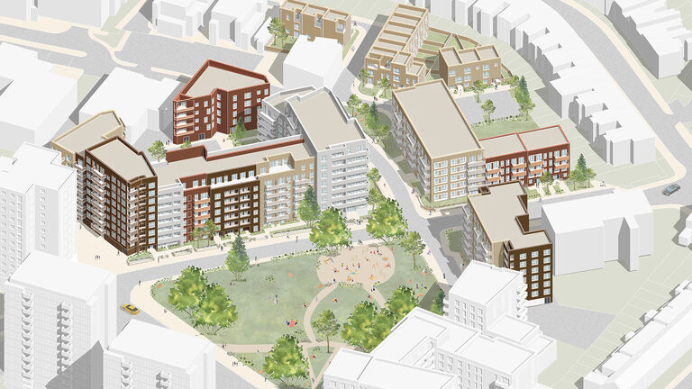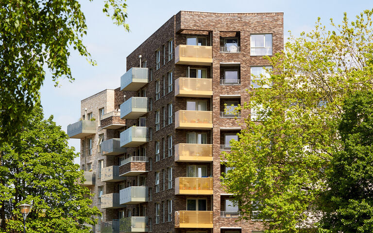 The second phase delivers 246 mixed-tenure homes that establish a new identity in the north of the estate. It transforms a once-isolated area of disconnected buildings into a vibrant neighbourhood characterised by clear street hierarchies, active frontages, and well-defined public spaces. The architectural approach uses a rich palette of brick tones, creating a subtle patchwork effect that references the area’s layered history while establishing a fresh identity. Building heights respond sensitively to context - rising to define key routes and spaces, while stepping down to harmonise with neighbouring properties.