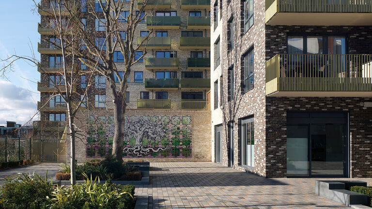 The first phase, a gateway development adjacent to South Acton overground station, comprises 124 mixed-tenure homes arranged around a south-facing communal garden and a station square. The scheme frames a new station square, featuring the “South Acton Tree of Life” mural, which celebrates the area's history and community.